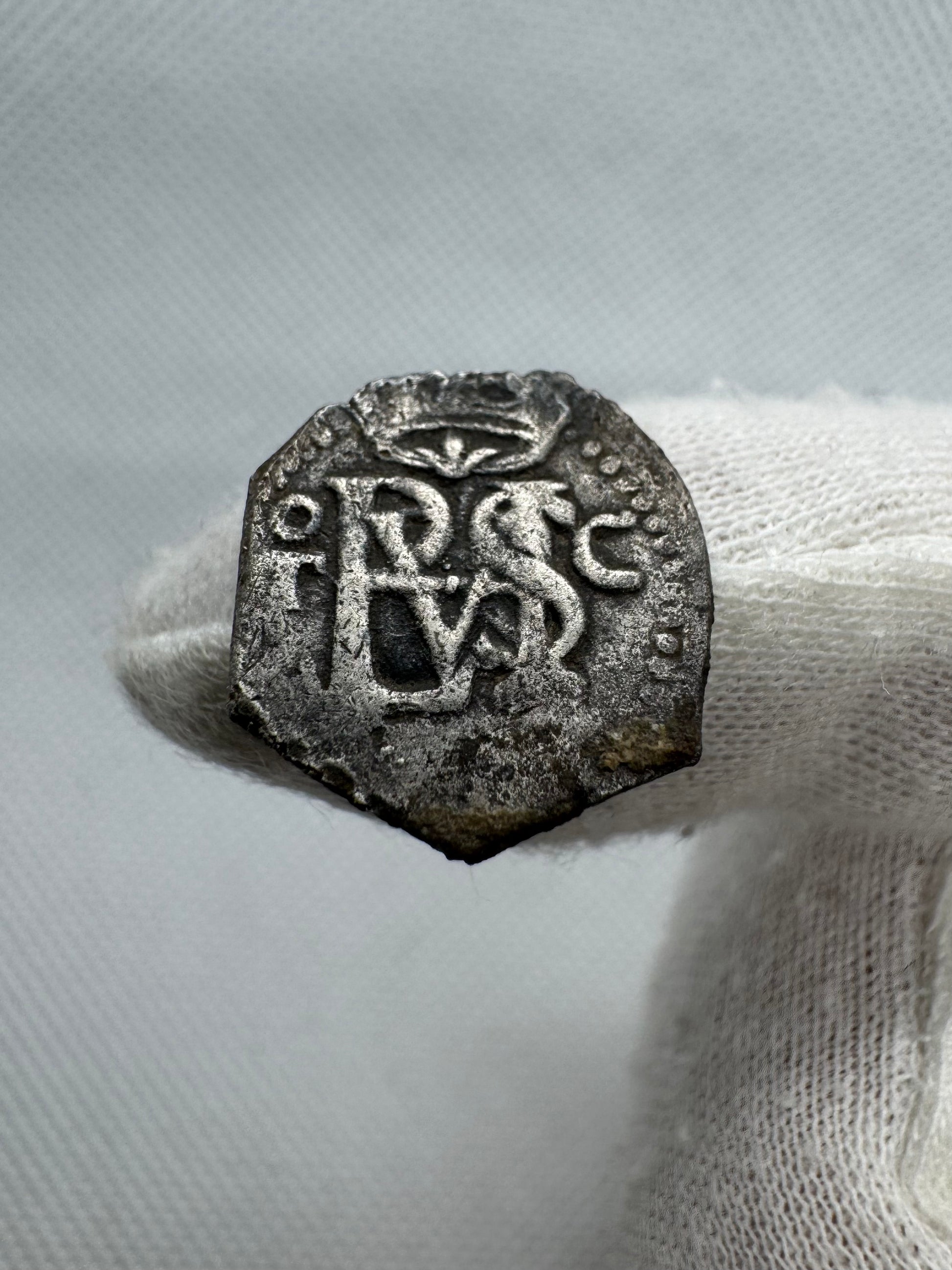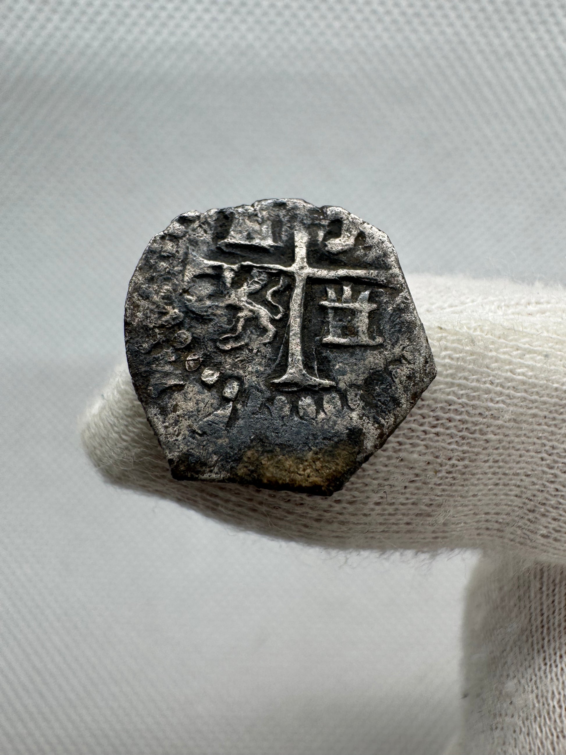 Medio Real extraordinariamente escaso de Toledo en los últimos años de Felipe II, con ceca “T” y ensayador “C” perfectamente visibles y fecha bajo el monograma. De la fecha sólo se aprecia con claridad la parte superior del primer “5”, lo que cuadra con la atribución a 1595 que Jarabo–Sanahuja consideran más probable (alternativa 1593). La pieza corresponde a la variante de diseño con ceca a izquierda, ensayador a derecha y fecha bajo el monograma, combinación muy poco documentada.