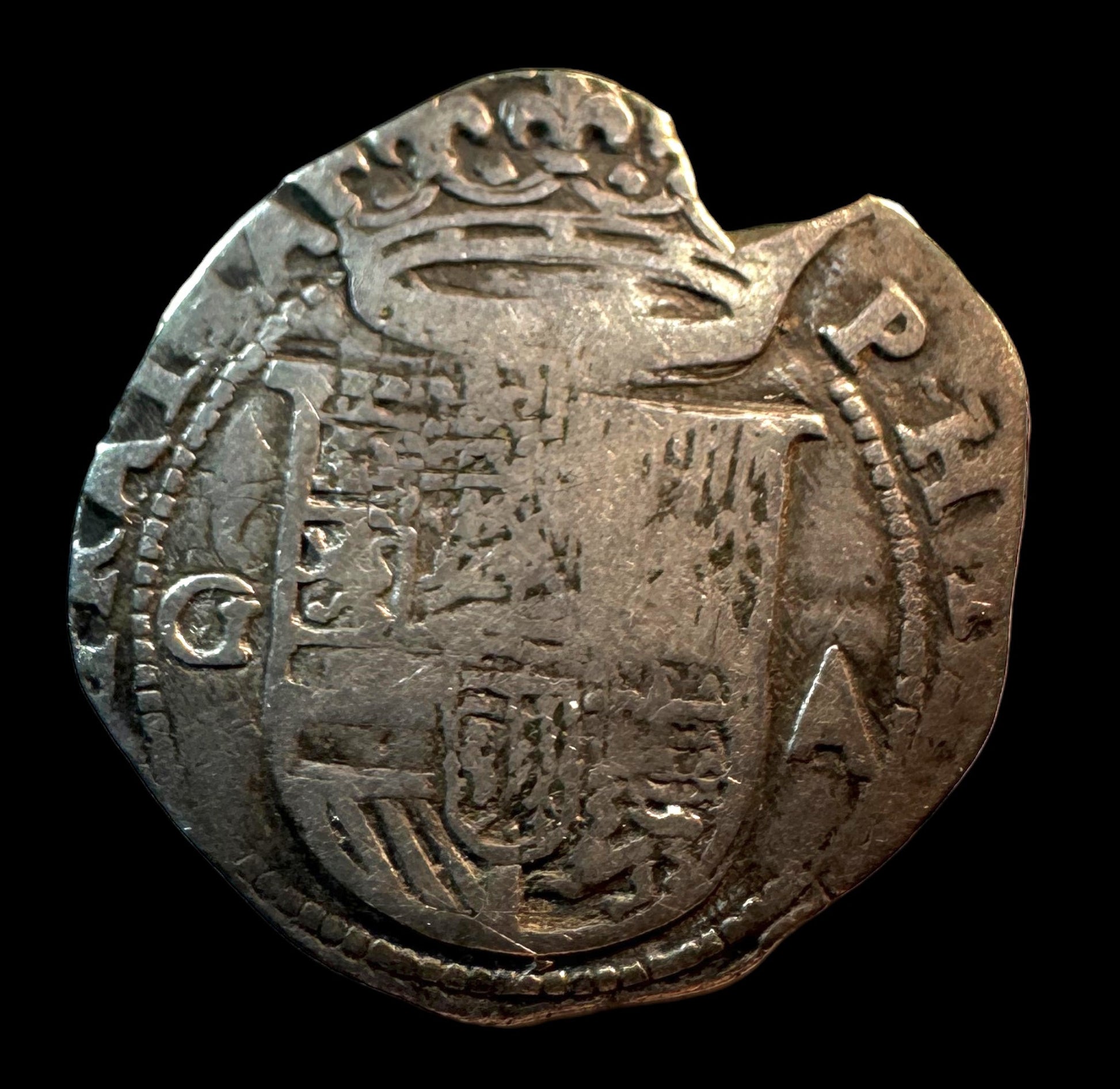 Raro real de Granada de las primeras emisiones de Felipe II, sin fecha. En el anverso vemos la marca de ceca G y la A del ensayador. En el reverso encontramos lo más llamativo: los leones están sobre castillos, todo indica que se inició un cuño de forma incorrecta y se corrigió apresuradamente, señal de que la ceca trabajaba con muy pocos cuños disponibles, probablemente reaprovechando matrices antiguas para una emisión corta y poco documentada. Los ejemplares de este tipo y ensayador rara vez se encuentran a la venta, y con esta combinación de errores el presente ejemplar es probablemente único. Conservación VF, detalles principales bien definidos y una leve grieta en la parte superior de la corona sin afectar al atractivo general. Pieza claramente destinada a llamar la atención de los coleccionistas más avanzados de Felipe II y, especialmente, de la ceca de Granada.