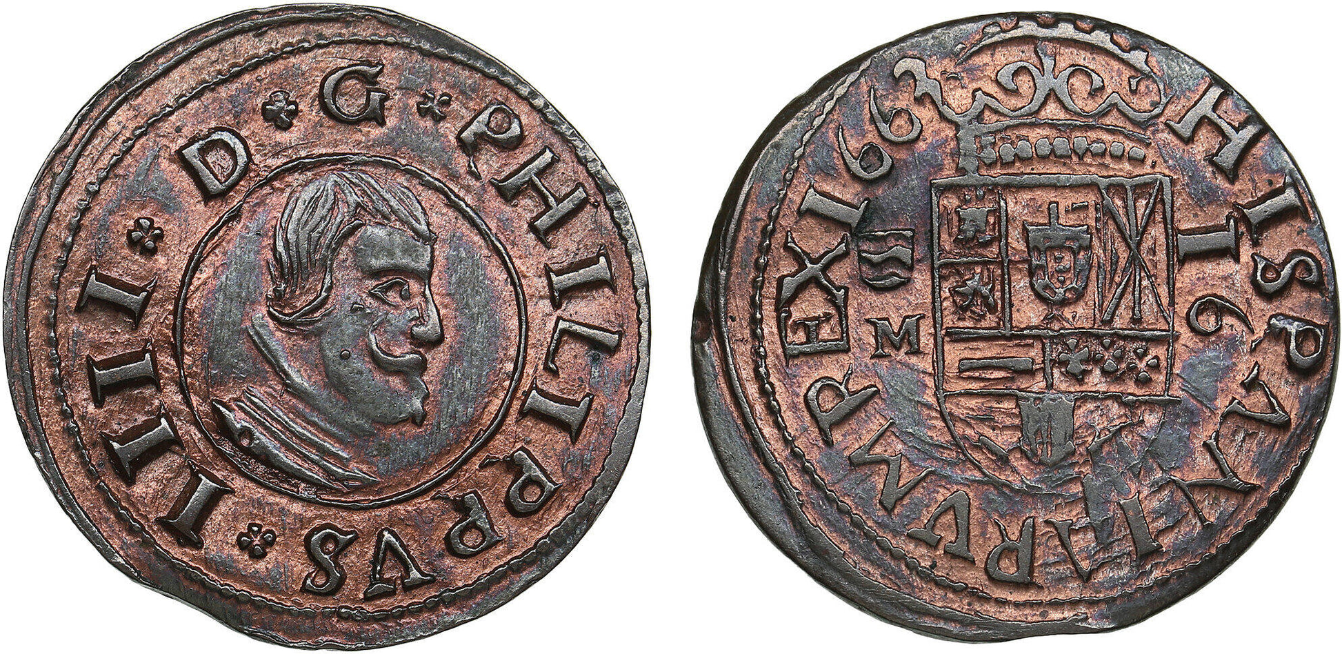 Tras la etapa de resellos y reajustes del vellón, la Corona impulsó en los años 1660–1664 una nueva iconografía con busto para los maravedís, buscando orden y reconocimiento en la circulación. Valladolid fue una de las cecas activas y el ensayador “M” firma las tiradas de 1663, hoy especialmente apreciadas cuando conservan el lustre de fábrica.